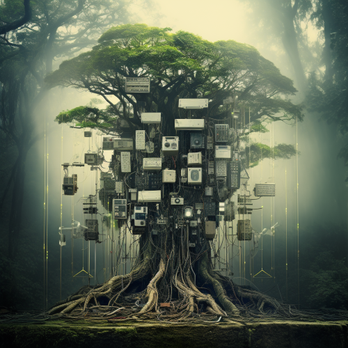 giant tree with a cpinal column as the trunk. in the middle of the forest. surrounded by digital elements and computers. Modern Subtle Wabi Sabi style. Aspirational. Photo Real.