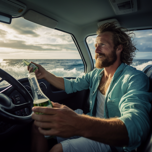 david Mundy AFL sports star driving his bpat on the ocean. he is saying no with his hand to a friend offering him a drink.