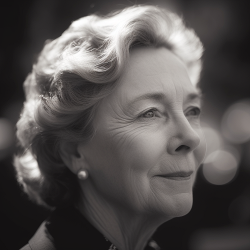 A gritty, black and white Lomography petzval 58 bokeh optical flare photography portrait of the french minister elisabeth borne, face portrait looking straight ahead, extreme swirly bokeh effect, radiant glow, soft-focus effect, Ilford HP5 PLUS, vignetting Magnification, --v 5.0