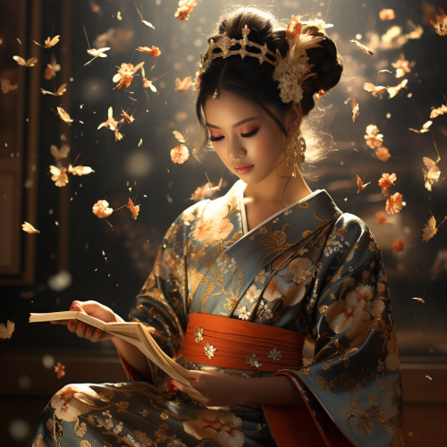 unique sparkly digital paper,Japanese Beauty,full body,whole body,Hairpin, Kougai and Comb hairstyles,Wearing a Japanese patterned dress with gold accents Costume,Japanese clogs,Dynamic Pose,picture books,The world's most complex,epic,masterpiece,8k --s 750 --style raw