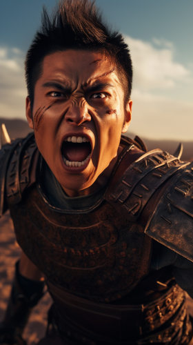 the photo of 25-years old ancient Chinese male warrior is screaming a voice , big eyes , rage , ancient Chinese traditional armor , long sword , highly detailed , Asian and Europe face , cinematic cyber taste lighting , desert background, taken by Nicon , --ar 9:16
