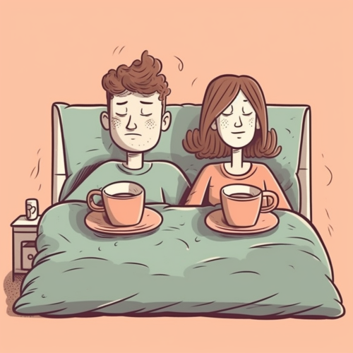 Cartoon eines Paares das im Bett liegt und eine Tasse Kaffee trinkt --v 5.0