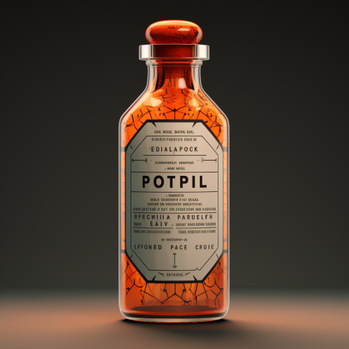 ultra-realistic nurse torso, light skin, only chin and lips visible, wearing dark purple medical scrub with high collar and long sleeves, with black gloves, holding with only hand a big transparent glass vial, with white empty label on it, gold background with no pattern