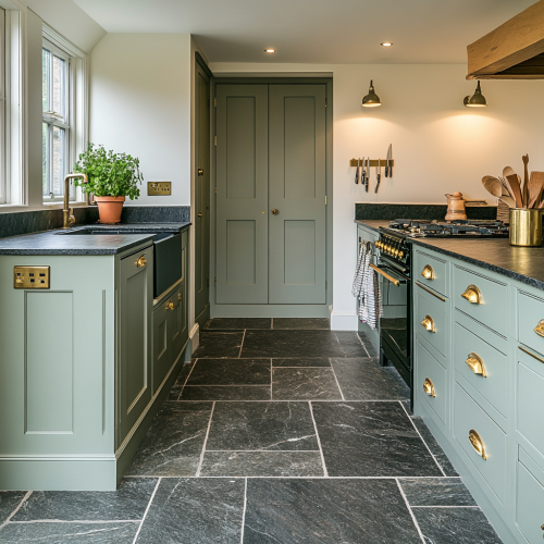 interior design photo of a kitchen with sage green cabinets, a dark quarts worktop and dark stone floor tiles. Cupboard handles and other fittngs are vintage brass.