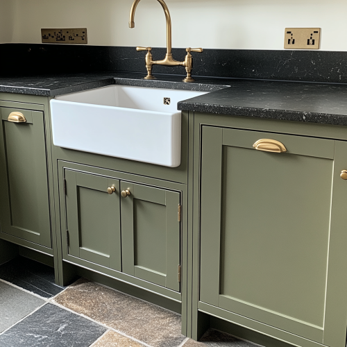 interior design photo of a shaker kitchen with sage green cabinets, a dark quarts worktop and dark stone floor tiles. White belfast sink. Cupboard handles and other fittngs are vintage brass. modern style.