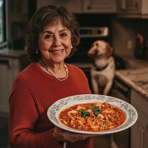 Show a Latina woman in her 70s holding a plate of lasagna soup in a real kitchen. Use a simple, clean background and highlight the product. There is a dog playing in the background, focus on the appearance of the product and the attractive details of the dish