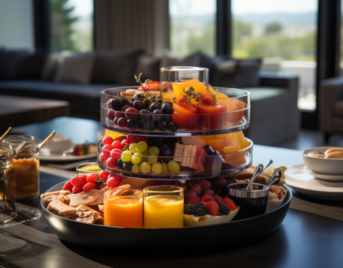 young woman carrying a cooking plate, showcasing it to the camera, smiling, with dark hair, sun-kissed skin and bright, expressive eyes, smiling to the camera. she is wearing a summer dress, full of flowers features, with a nice necklace that holds the letter S, wearing sandals, with light make up, with a wedding ring. behind her, there is a green styled modern kitchen area with a inner lighting features and stone styled ceiling, the overall scene captures the energy and vibrancy of her smile.