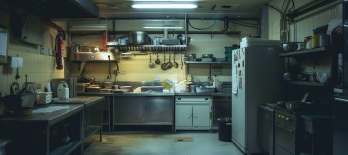 an industrial kitchen all cleaned up and packed away, all the staff have gone home, the lights are off and it is only lit from the light coming through a window as well as the smoke alarm LED --ar 9:4 --v 6.0 --style raw