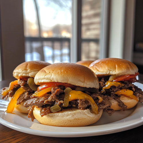 RECIPE NAME: Philly Cheesesteak Sliders | Amateur photo from reddit, taken with an iPhone 15 Pro. | SHOT TYPE: taken in a kitchen in front off the window on table