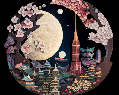 stunning illustration of an elaborate puzzle featuring the Tokyo skyline, showcasing iconic landmarks like Buddhist temples and skyscrapers, set against a backdrop of cherry blossoms and a moonlit sky. The focus is on the intricate details and the interplay of light and shadow. --v 4 --ar 5:4