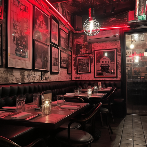 photo of a dark soho london basement restaurant seating area, there are black and white photos of old soho on the walls. there's a slight neon touch to the black and white photos. --v 6.0