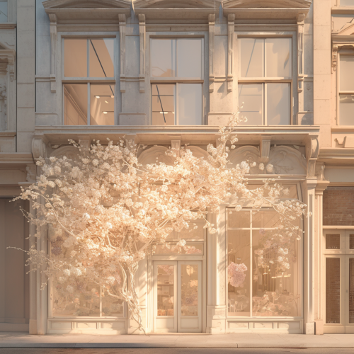 Within the cool, minimalist ambiance of a luxury pop-up store (the size of the store is 4m width and 5m in depth. The ceiling is roughly 3.5m in height). There is a singular, gigantic hot air balloon installation takes center stage. This is not an ordinary balloon but an artistic marvel constructed from black leather and aqua blue fur, creating a dramatic centerpiece in the retail space. On either side of this stunning structure, sleek, curved metal clothing racks hold an array of high-end pet fashion. This single, unique hot air balloon amid the stylish pet apparel grants the entire scene an exceptional blend of extravagance and photogenic appeal.