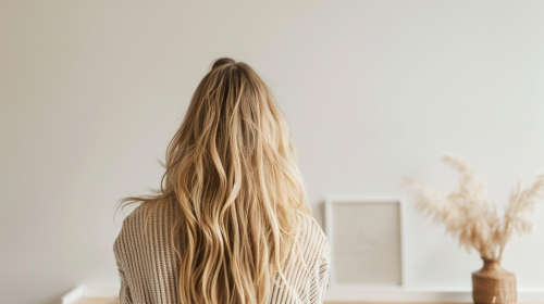 instagram style photography of a blonde, looking at an empty white wall. The room has a tranquil vibe with a soft, natural color palette and includes a desk with a lamp, a comfortable, homey atmosphere. Photography shot from behind --ar 16:9 --style raw --v 6.0