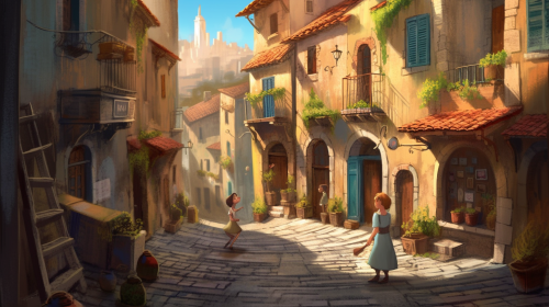 Amidst the narrow streets of an ancient Roman village, a young woman navigates with a map, her fingers tracing the worn paths while a man, adorned in a traveler's attire, follows closely, his eyes scanning the horizon with a telescope, the surroundings alive with the whispers of history, Painting, watercolors on textured pape,r3D Pixar Disney Style,, --ar 16:9 --v 5.0