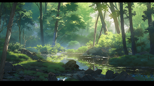 (masterpiece) (highly detailed) Bckground image of a dense forest, Dense trees with pools of shadow and shadow dappling. in the style of Studio Ghibli. --ar 16:9 --niji