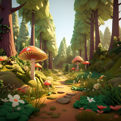 3D render of a mysterious, dense forest bathed in the soft light of dawn. The tall trees, with their thick trunks and intertwining branches, create a canopy that filters the morning sunlight, casting long shadows and illuminating patches of fog that hover close to the forest floor. The scene should evoke a sense of wonder and mystery, with subtle details like dew-covered leaves and distant sounds of nature --ar 7:4