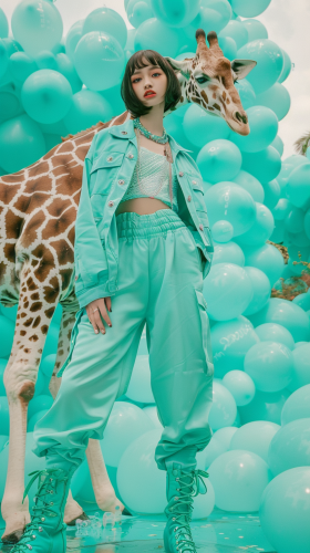 Full body photo. 18 year old very cute Japanese fashion model. Savannah background, wearing fashionable luxury brand clothing. Large stuffed mint green giraffe::5 , mint green giraffe print clothing::4 , short hair, matching hair color to clothing. Background is savannah with mint green colored giraffe. High image quality. canon EOS R6. shooting pose: high fashion pose] --ar 9:16 --style raw --v 6.0