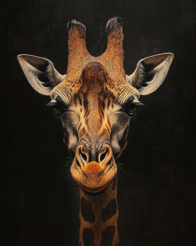 Rembrandt's painting depicting front view our subject looks down at us, portrait of a giraffe towering over us with a strong jaw, looking serious but relaxed, very realistic image and dramatic lighting deep blacks --ar 4:5