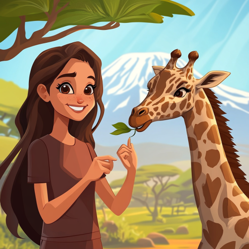 Female character who has long brown hair and dark brown eyes and smiling face is on an African safari in the savannahs feeding a giraffe a leaf. Can consider Mt. Kilimanjaro in the background.