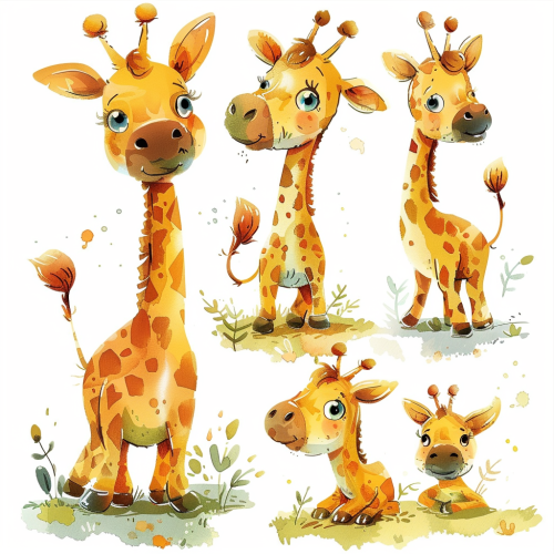 girafe, cute, in the style of an aquarelle for an illustrated children book, no background, multiple poses --v 6.0