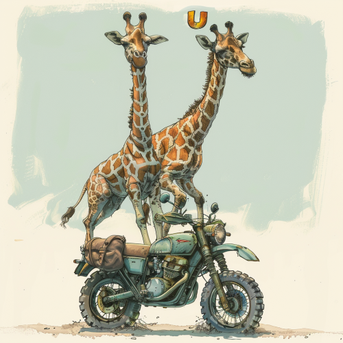 A giraffe riding in a motorcycle. Standing on top of the first giraffe is a second giraffe. The giraffe on top is holding the letter U over his head. --v 6.0