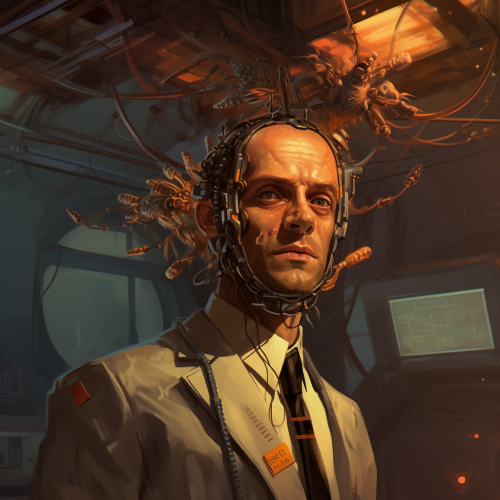 human detective with insect antennas growing out of his forehead. he is in a space cantina