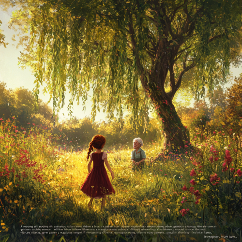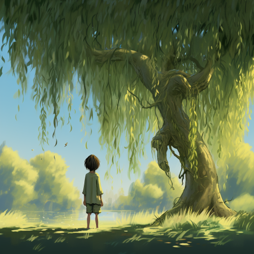 In an enchanted grove, where shadows and light weave together in a dance, a girl stands under a large willow tree. The branches, heavy with leaves, create a canopy of shadows, allowing only slivers of sunlight to pass through. She reaches out to touch the dappled shadows on the ground, her face showing a quiet indulgence in the serene and magical ambiance of the grove. The air is filled with the soft hum of nature, accentuating the mystical quality of the scene, eerie-colored moss and fern plants, and brightly glowing rainbow-colored mushrooms covering the ground --s 750