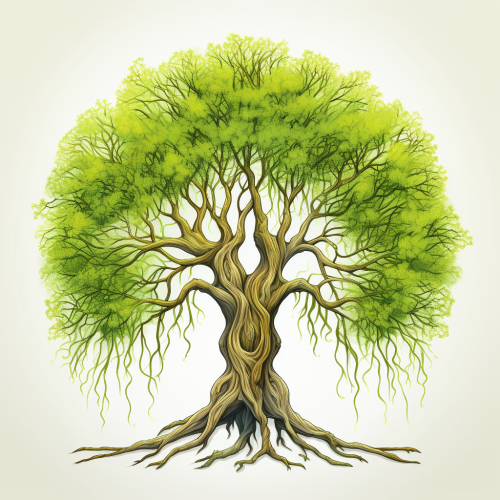 A surrealistic digital art piece of an elegant willow tree with long, hanging leaves standing on the edge of calm water, creating a dreamlike and ethereal atmosphere. The background is a soft gradient from light gray to pale yellow, adding depth and tranquility to the scene --ar 4:5