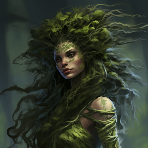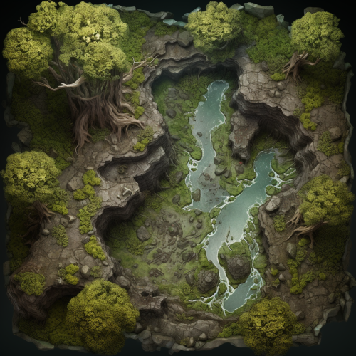 a top down rpg battlemap of a grove with ancient massive gnarled trees, thick underbrush, rocks and boulders, an area of thick misty atmosphere, a ruined altar, two small stagnant pools filled with glowing liquid, a hidden cavern nesteld between the roots of one of the trees, overgrown roots.