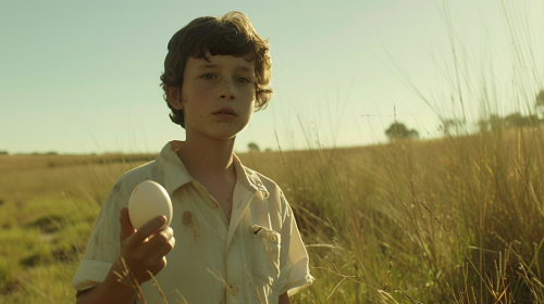 film still, 10 year old boy holding an egg on a spoon, wide shot, walking in the middle of nowhere, green australian landscape, idyllic, sunny, filmic --ar 16:9