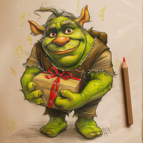 ogre is holding a gift, cartoon style, easy paint, green pencil drawing