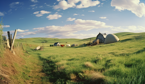 farm with farmhouse and open barn house garage on the left side of a montana grass hill prarie landscape with leather work boots growing out of plants, idyllic, mushrooms, plants, wild animals --ar 12:7