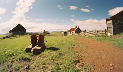 idyllic sunny farm with farm house and garage building on the left side of a montana grass hill prarie landscape with leather work boots, boots, kodak portra 800, film grain, Sony VX1000 fisheye lens, harsh flash --ar 12:7