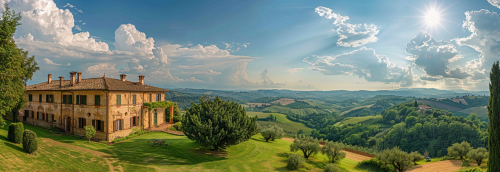 panoramic photo of an italian villa overlooking a valley, breath taking --ar 26:9 --v 6.0