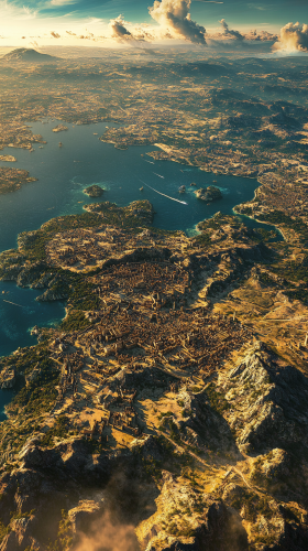 A breathtaking aerial view of the ancient Roman Empire at its peak, stretching across five million square kilometers, with cities, fortresses, and the vast Mediterranean Sea in the background, surreal hyper-realistic --ar 9:16