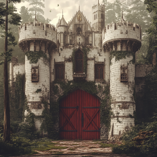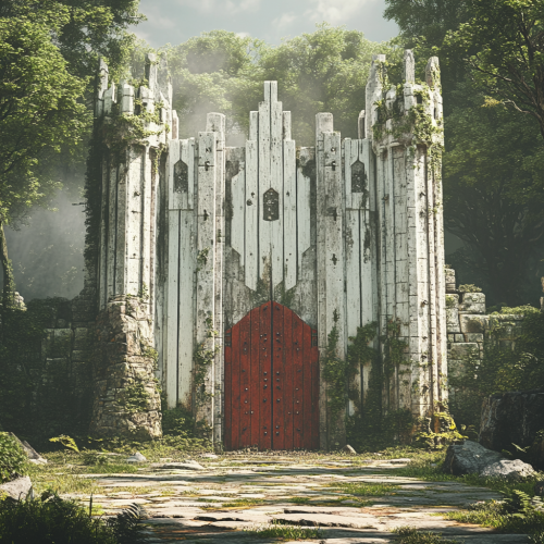 Medieval Fantasy Art Style, A square timber Castle made entirely of white wooden planks and a grand red wooden gate. Overgrown ancient forest background.