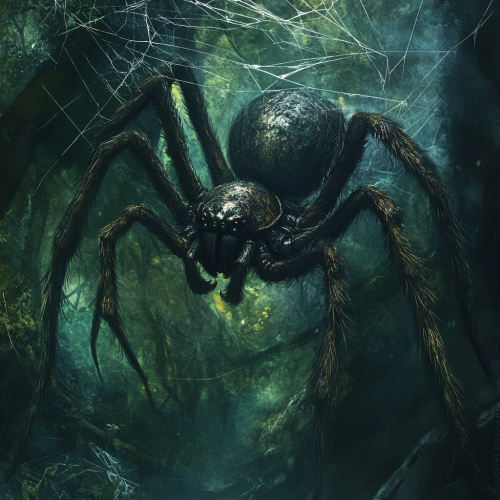 fantasy creature, realistic, Harry Potter theme, A massive, ancient spider whose web can span entire forests. It appears in the Amazon, weaving webs that turn day into night and ensnaring both Muggle and magical creatures alike. Its venom causes hallucinations and nightmares, slowly driving those affected mad.