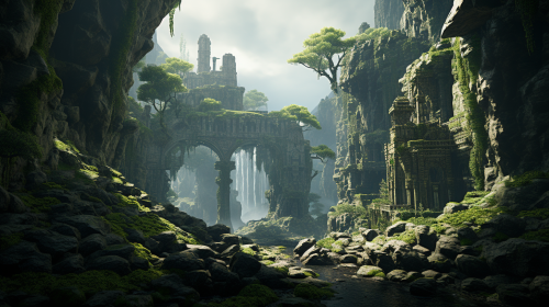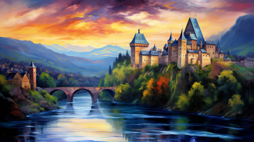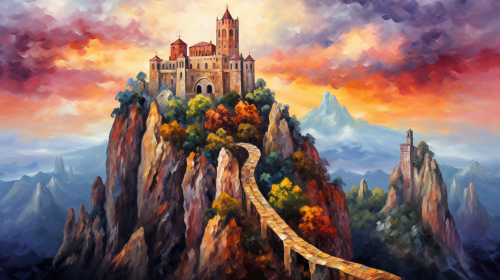 ultra-wide Charles Angrand painting of fantasy scene, ancient trees, hills, caves, castles, wooden fortresses, verticality --c 20 --w 20 --ar 16:9 --s 50