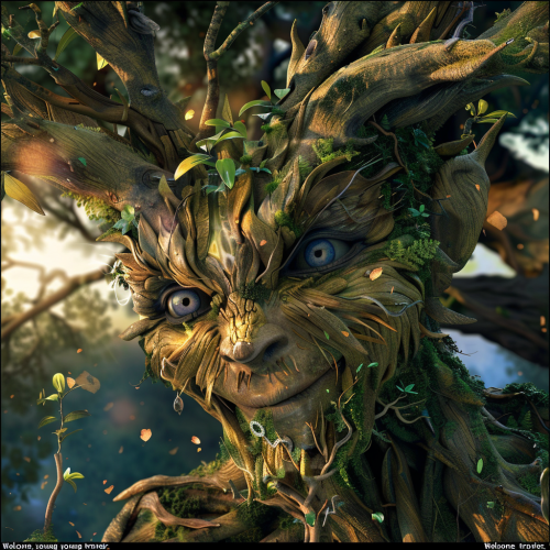 Jack approached, he noticed that the trees seemed to be whispering to each other. Suddenly, the trees came to life, their branches swaying in greeting. "Welcome, young traveler," they murmured in unison. "We are the Guardians of the Forest. create a 3D animation style cartoon animated image which looks hyper realistic.