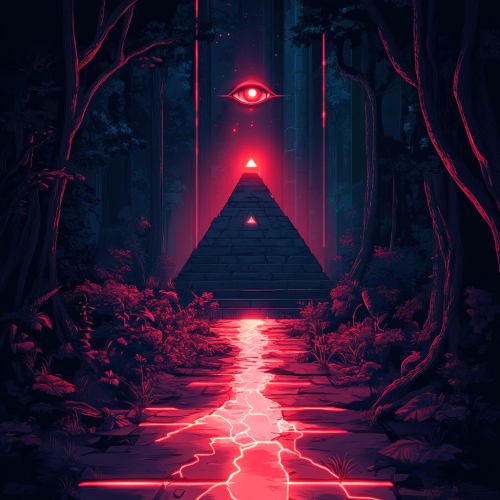 Arcade game style construction of a dark forest with red neon lights flowing through the ground, a medival pyramid structure in the middle with an eye on top, vector style, game art --ar 1:1