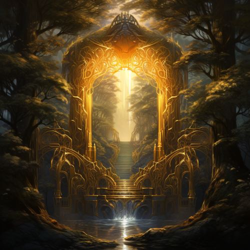 fantasy magic card with a art noveau illustration of a golden gate in a forest