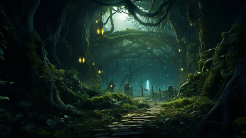 realistic illustration of an ethereal fantasy dream in green forest, wallpaper, cinematic, --ar 16:9