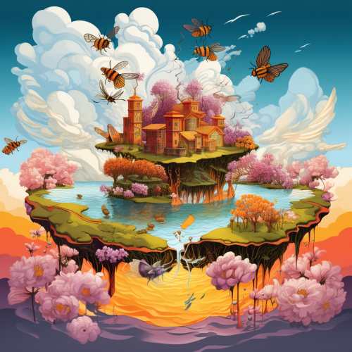 a surreal illustration of a floating island of honey combs and honey bees, New Yorker magazine art style, elegant, vivid colours, surreal, flying wild flowers, blue orange green clouds, elegant, magic animals