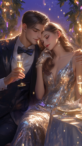 create a dinner scene in a castle atrium looking at the sky and you can see stars. It's a private dinner for two with twinkle lights inside the castle atrium, very romantic