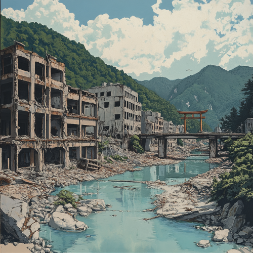 A view of a hot spring town along a river, such as Kinugawa Onsen, with a row of hotels across the river. The hotels are in ruins, with dilapidated windows and walls. There is a bridge across the river, and a broken torii gate on the opposite bank. A representation that resembles a landscape photograph.