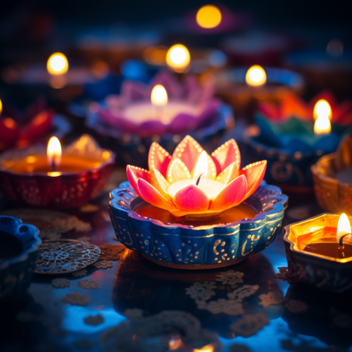 Photo of colorful diya lamps on a table with lotus flowers, against a blue background, with bokeh lights in the dark night. real photogrpahy, insane detail, cinematic, fujifilm superia, full HD, taken on a Canon EOS R5 F1.2 ISO100 35MM, smooth light, Incredibly detailed, sharpen details, cinematic production still, 8k, HD, cinematography, photorealistic, epic composition Unreal Engine, Cinematic, Color Grading, Ultra-Wide Angle, Depth of Field, hyper-detailed, beautifully colored, insane detail, intricate detail, beautifully colored, Unreal Engine, Cinematic, Color Grading, Editorial Photography, Photography, Photo Shoot, Depth of Field, DOF, Tilt Blur, White Balance, 32k, Super Resolution, Megapixel, ProPhoto RGB, VR, Half Moon Lighting, Backlighting, Natural Lighting, Incandescent, Fiber Optic, Mood Lighting, Cinematic Lighting, Studio Lighting, Soft Lighting, photos realistic, Volumetric, Beautiful Lighting, Accent Lighting, Global Illumination, Global Illumination, Global Illumination in Screen Space, Global Illumination by Ray Tracing, Optics, Dispersion, Brightness, Shadows, Roughness, Glare, Ray Tracing Reflections, Lumen Reflections, Reflections in Screen Space, Diffraction Gradation, Chromatic Aberration, GB Displacement, Scan Lines, Ray Tracing, Ray Tracing Ambient Occlusion, Anti-Aliasing, FKAA, TXAA, RTX, SSAO, Shaders, OpenGL-Shaders, GLSL-Shaders, Post Processing, Post-Production, Cel Shading, Tone Mapping, CGI, VFX, SFX, insanely detailed and intricate, hyper-maximalist, elegant, hyper realistic, super detailed, dynamic pose, photography, 8k advertising, hyperrealistic, detailed, Natural Lighting, CGI, VFX, SFX, insanely detailed and intricate, hyper-maximalist, elegant, hyper realistic, clean plain background --v 5.2