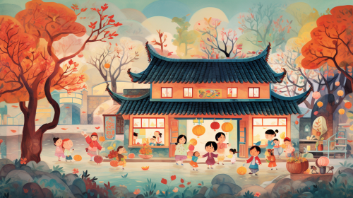 a heartwarming Japanese ink-style illustration featuring an enchanting house that radiates comfort and coziness, instantly evoking a feeling of 'home' for all. Infuse the scene with whimsical charm, vibrant colors, and friendly details to capture the essence of universal warmth and belonging, creating an image that resonates with both children and adults alike, 8k --ar 16:9
