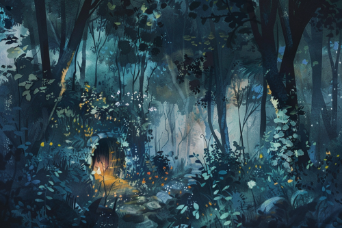 ancient forest filled with towering trees and glowing fireflies, kids book illlustartion, Disney style, --ar 6:9 --v 5.2 --s 250