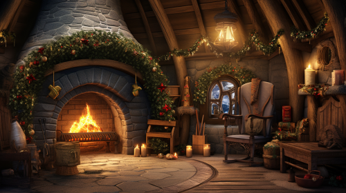 3d amazing night christmas hobbit house interior with fireplace and christmas tree, window with a night forest view, unrel engine 5 --ar 16:9