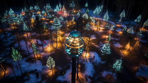 a forest of Christmas trees with ornaments and lights, view from drone --ar 16:9 --v 5.2